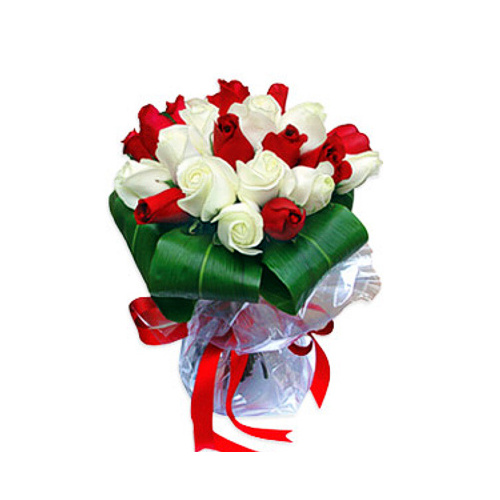 Bardzo elegancki bukiet z 10 białych i 10 czerwonych róż przybranych zielonymi liśćmi aspidistrii. Dodatkowo przyozdobiony kokardą i papierem dekoracyjnym. Idealny na prawie każdą okazję!
