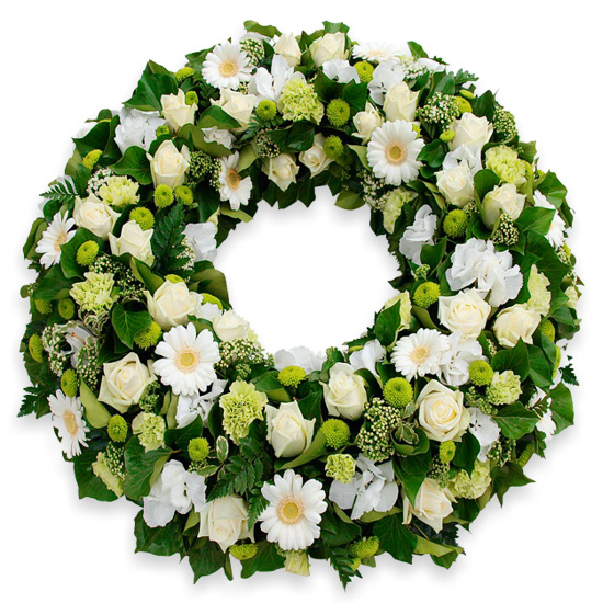 Duży (około 90-100 cm średnicy) wieniec pogrzebowy z kwiatów mieszanych w biało-cytrynowo-kremowej kolorystyce: róże, gerbery, goździki, santini, eustomy*, z obfitym przybraniem zielenią. Mamy w ofercie również wersję powiększoną tego wieńca: Biało-Zielony Wieniec Pogrzebowy (powiększony) oraz podobny wieniec w czerwono-biało-cytrynowej kolorystyce: Biało-Czerwony Wieniec Pogrzebowy.