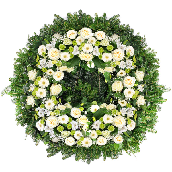 Bardzo duży (około 120-130 cm średnicy) wieniec pogrzebowy z kwiatów mieszanych w biało-cytrynowo-kremowej kolorystyce: róże, gerbery, goździki, santini, eustomy*, z obfitym przybraniem zielenią. Mamy w ofercie również nieco mniejszą wersję tego wieńca: Biało-Zielony Wieniec Pogrzebowy oraz podobny wieniec w czerwono-biało-cytrynowej kolorystyce: Biało-Czerwony Wieniec Pogrzebowy.